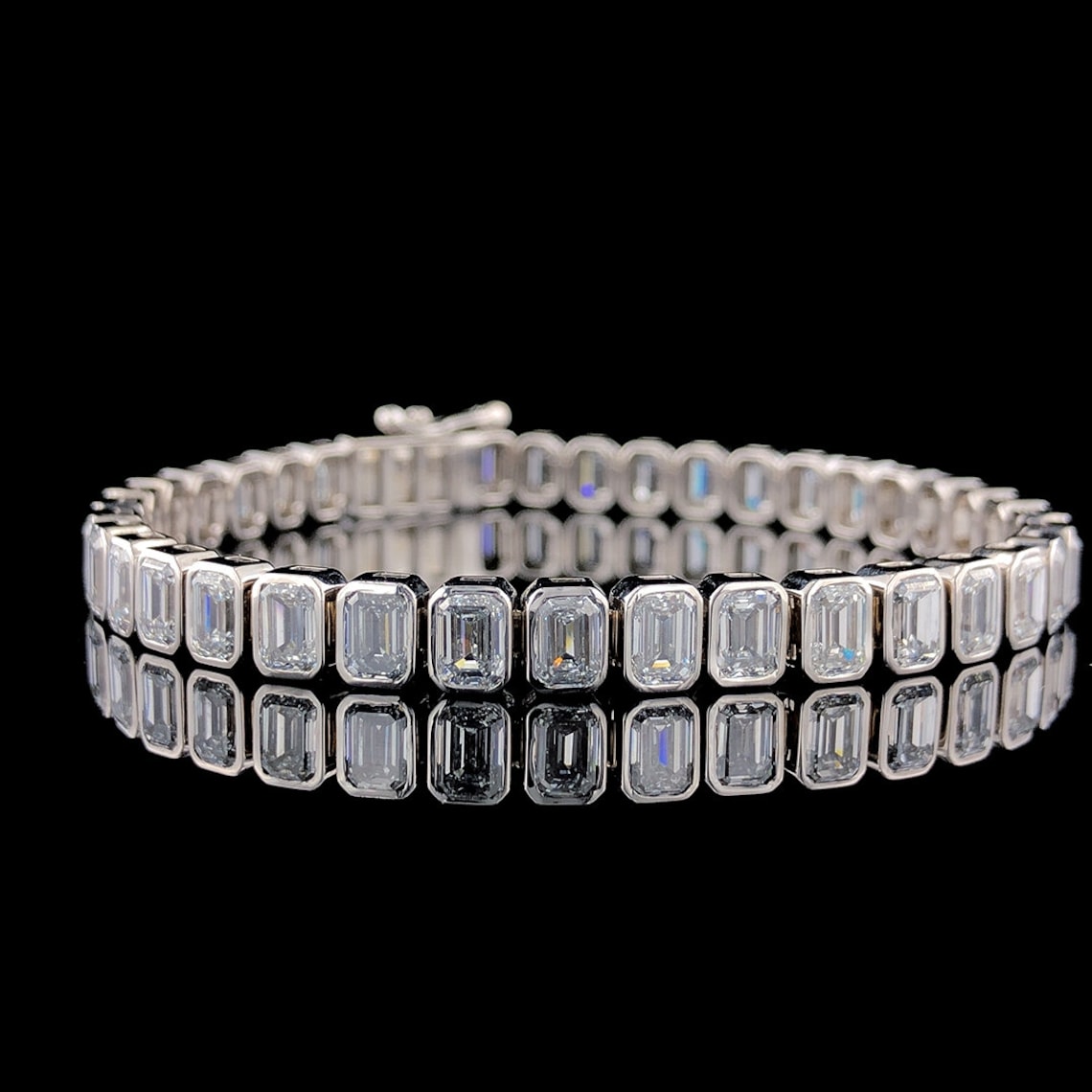 Crafted with meticulous attention to detail, this bracelet features brilliant moissanite stones that are bezel-set in your choice of precious metal: sterling silver, 10k, 14k, or 18k white gold. Each stone is handpicked for its luster, clarity, and color, mirroring the brilliance of diamonds at a fraction of the cost. The classic tennis style lends a timeless elegance that gracefully adorns your wrist, making it a versatile piece perfect for both everyday wear and special occasions. The bracelet is designed with a secure clasp to ensure it stays with you as a lasting memento of your unforgettable moments.