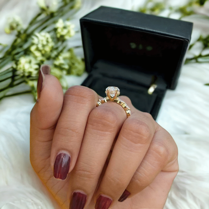 Step into the world of timeless romance with our Luxurious Moissanite Diamond Engagement Ring. Exquisitely handcrafted to symbolize your unique love story, this antique solitaire is a masterpiece of design and craftsmanship. Nestled within a majestic cathedral setting, the brilliant moissanite diamond radiates a fire and brilliance that rivals the stars. At Diamond Vishwa, we take pride in creating bespoke treasures that celebrate the most memorable moments in your life, and we are delighted to offer customization to craft a ring that’s as unique as your bond.