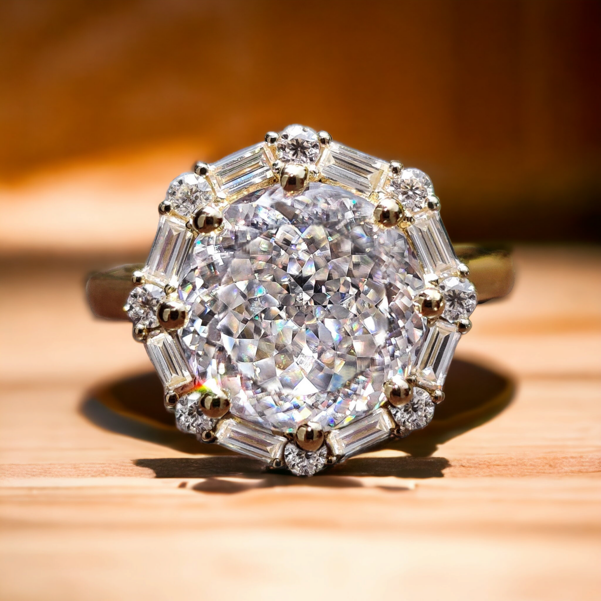 Vintage Style Engagement Ring, Portuguese Cut Moissanite Halo Ring, Baguette and Round Cut Halo Ring